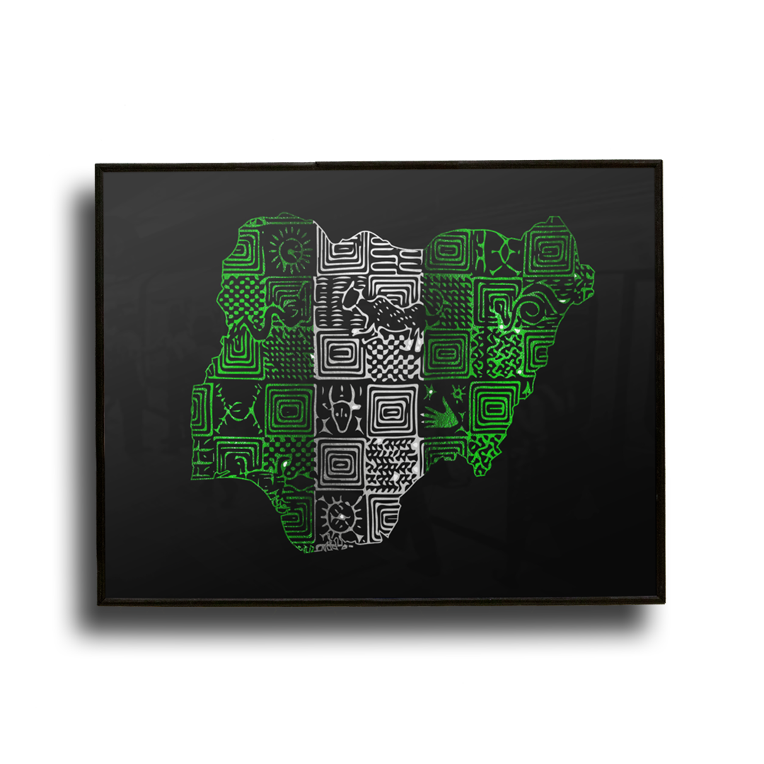 On October 1st 1960, Nigeria became officially independent from the British. Nigeria is the most populous black nation on Earth. It is home to the second largest film industry on the globe whilst also being the fashion, technological and creative hub in Africa. The Nigerian people are known for their vibrant and friendly energy expressed through diverse creative expressions. Featuring the Nigerian Map and Flag on a traditional print, this poster is finished in a premium mink foil that will illuminate your room.